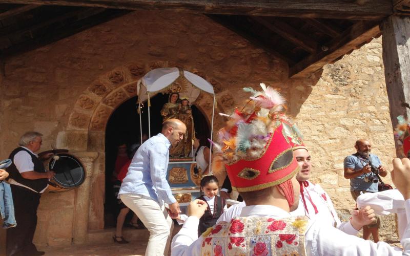 Como es tradicional, los jóvenes de la localidad bailaron ante la Virgen antes de su salida de la iglesia, durante el recorrido y formaron un espectacular arco en su entrada a la ermita. Vestidos con falda --algo habitual en otros pueblos de la zona como Orejana o San Pedro de Gaíllos--, pero portando un gorro peculiar tanto por su forma como por las plumas que lo adornan, los jóvenes volvieron a poner la nota de color en la jornada. A su baile de paloteo, se sumaron las chicas, quienes hace unos años se incorporaron al baile de la procesión ataviadas de segoviana, un cometido reservado hasta entonces a los chicos.