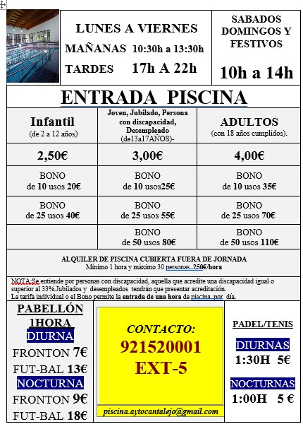 Información sobre los horarios de las instalaciones, teléfonos de contacto, así como información sobre los precios de pabellón, piscina y pistas de pádel y ténis.