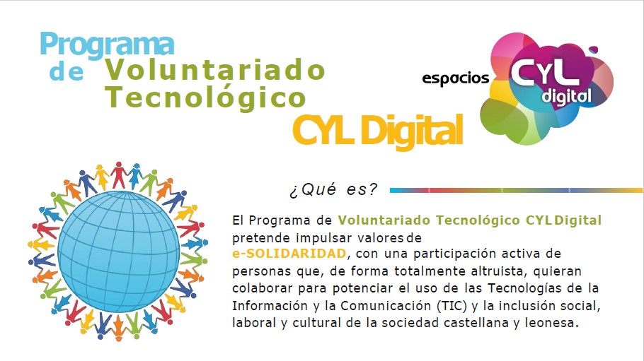 El Programa de Voluntariado Tecnológico CYL Digital pretende impulsar valores de e‐SOLIDARIDAD, con la participación activa de personas que quieran colaborar para potenciar el uso de las Nuevas Tecnologías en su entorno.