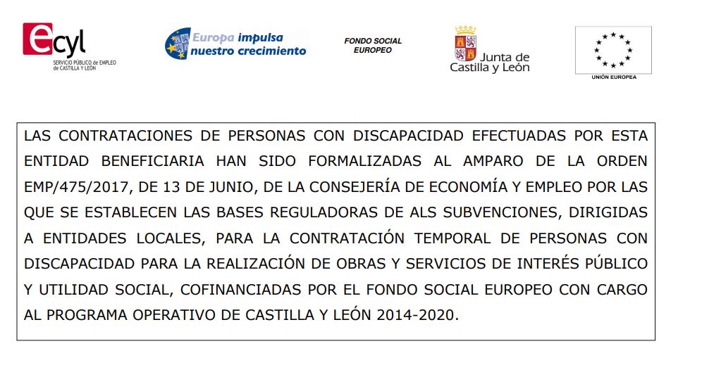 Al amparo de la orden EMP/475/2017 de 13 de junio, se ha contratado a una persona con discapacidad durante 90 días, con la categoría Peón/Conserje a jornada completa, subvencionada al 100% por la Junta de Castilla y León con el Apoyo financiero de la Unión Europea.