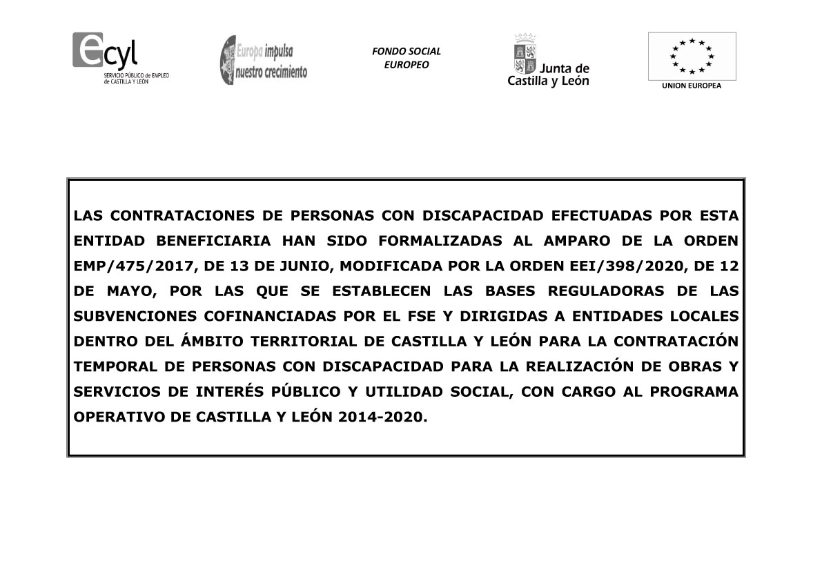 CONTRATACIÓN DE PERSONAS CON DISCAPACIDAD 2021 CONTRATACIÓN DE PERSONAS CON DISCAPACIDAD 2021 Contratación de persona con discapacidad en el marco del programa operativo Castilla y León 2014-2020 (ELEX). Documentos CONTRATACIÓN PERSONA CON DISCAPACIDAD JCYL.pdf (pdf 369,3 kB)