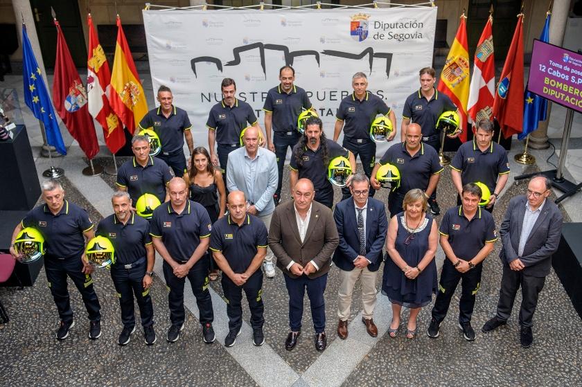 El patio de Columnas del Palacio Provincial ha acogido el acto en el que han tomado posesión de sus puestos once cabos que se integran en el Servicio de Prevención y Extinción de Incendios y Salvamento (SPEIS) de la Diputación de Segovia. Un nuevo paso en la conformación del organigrama y la estructura de un servicio que “va a repercutir directamente en la vida de los vecinos del medio rural segoviano”, como ha destacado el presidente, Miguel Ángel de Vicente, durante su intervención en el acto y en referencia a los nuevos incorporados.