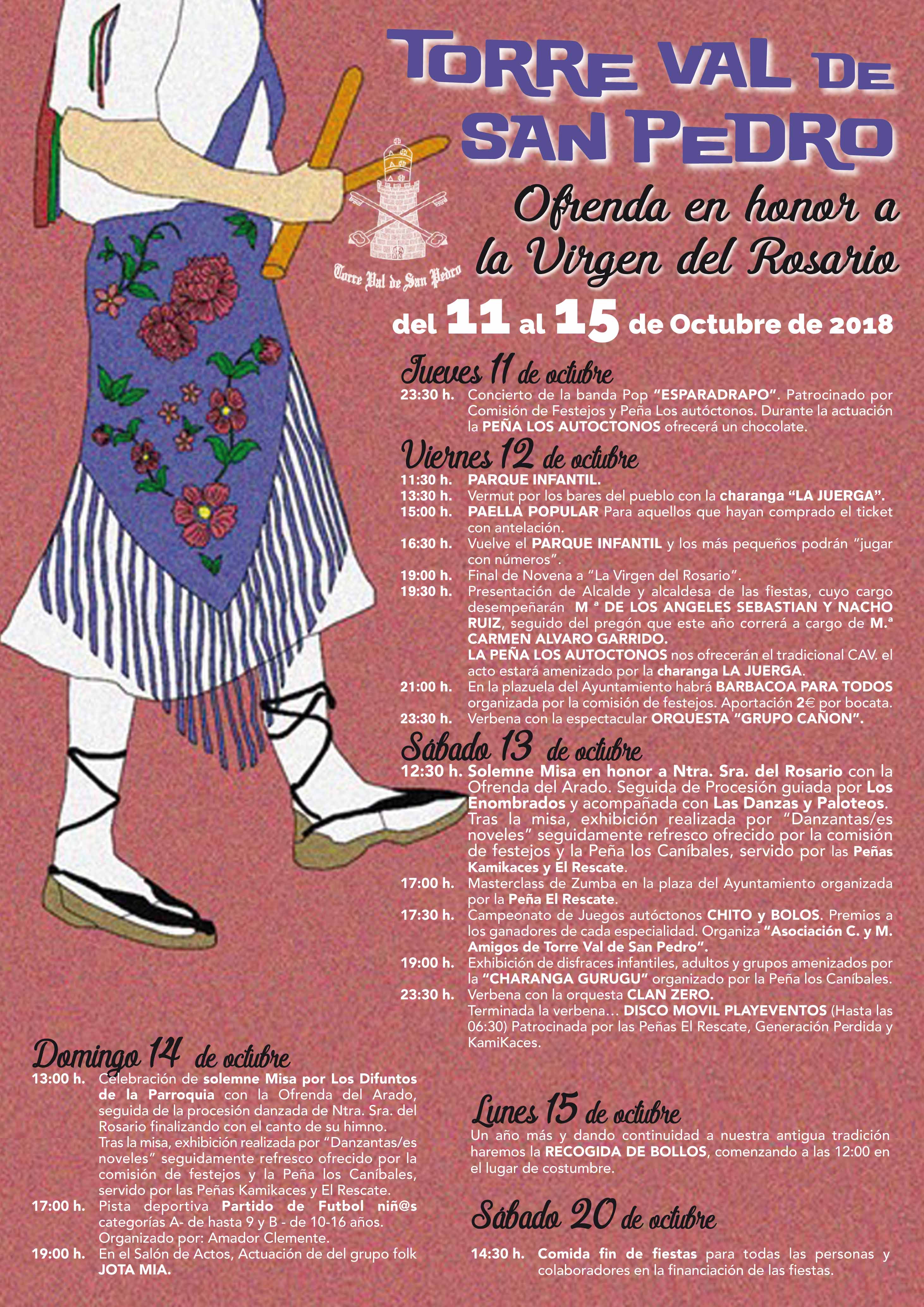 FIESTAS EN TORRE VAL DE SAN PEDRO 2018 FIESTAS EN TORRE VAL DE SAN PEDRO 2018 OFRENDA A LA VIRGEN DEL ROSARIO Del 11 al 15 de octubre de 2018 Programa adjunto Documentos Programa fiestas torre 2018 definitivo (1).pdf (pdf 2,9 MB)