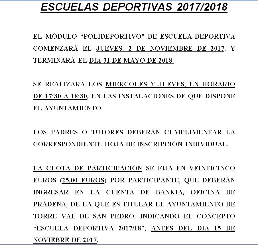ESCUELAS DEPORTIVAS 2017/2018 ESCUELAS DEPORTIVAS 2017/2018 Horarios y cuotas de las escuelas deportivas. Documentos Noticia web Escuelas deportivas.doc (doc 27,5 kB)