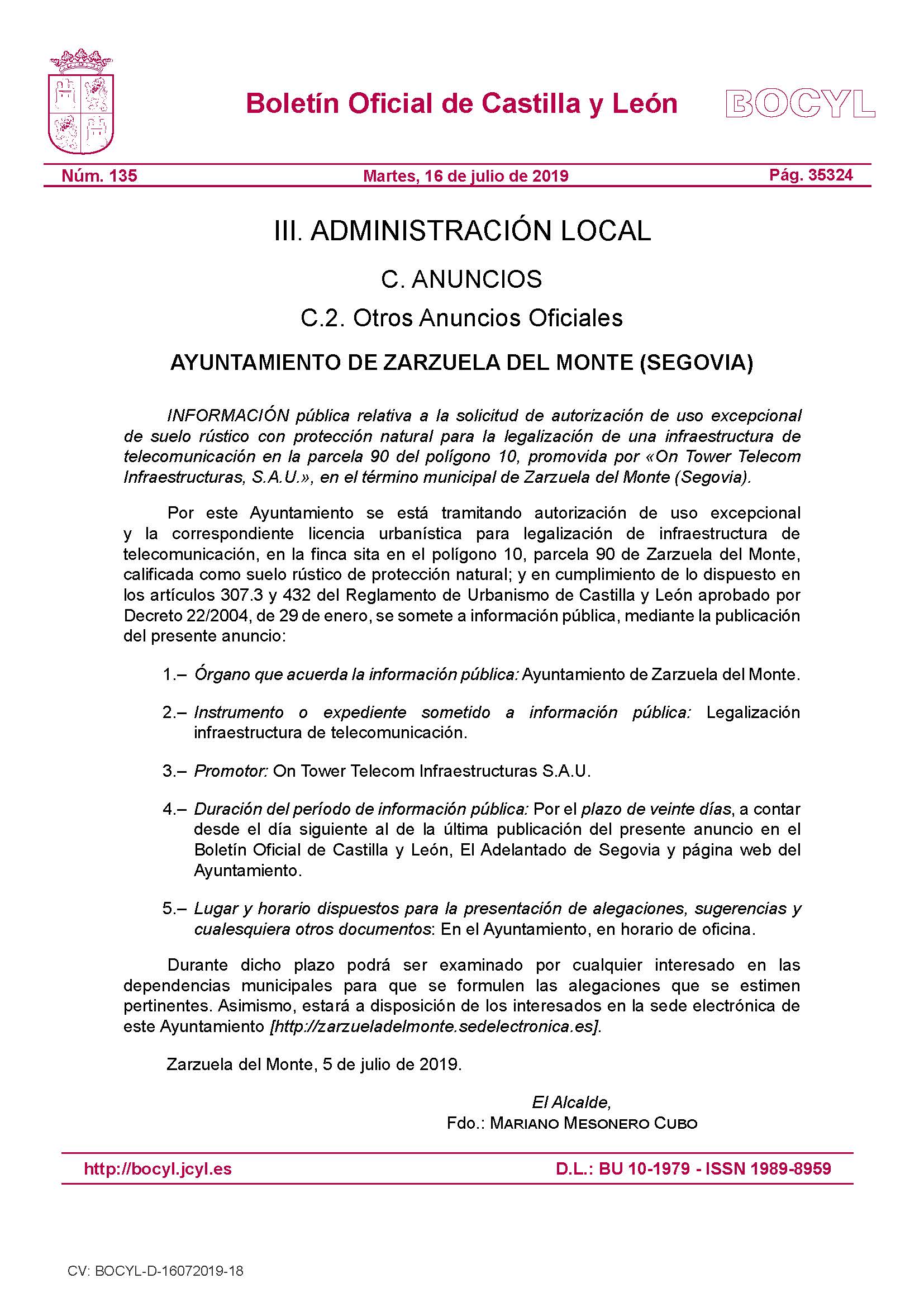 Información pública relativa a solicitud de autorización de uso excepcional de suelo rústico con protección natural para la legalización de una infraestructura de telecomunicación en la parcela 90 del polígono 10, promovida por On Tower Telecom infraestructuras S.A.U. en el término municipal de Zarzuela del Monte (Segovia)