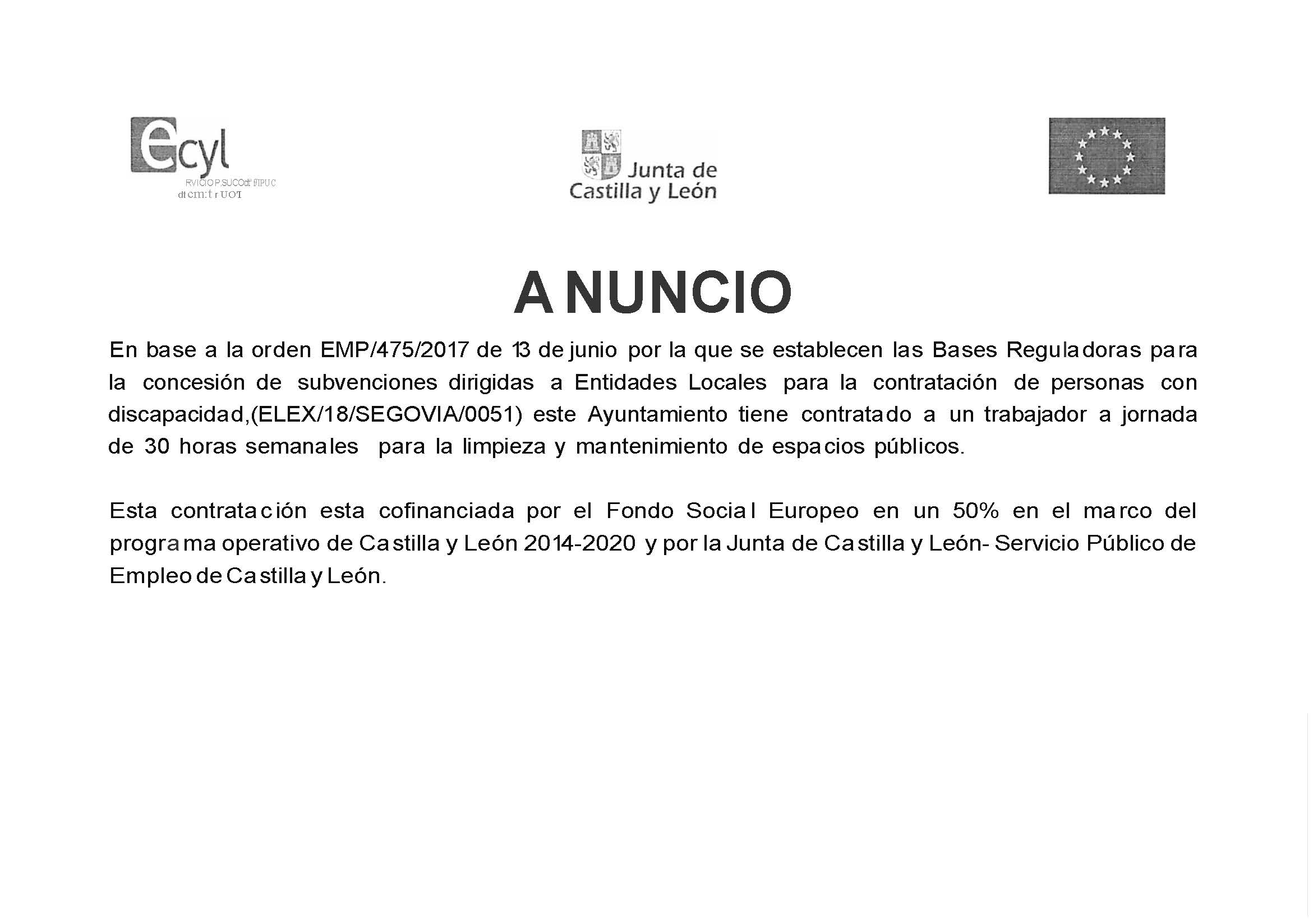 Resolución del Servicio Público de Empleo de Castilla y León por la que se resuelve la convocatoria de subvenciones cofinanciadas por el Fondo Social Europeo, dirigidas a Entidades Locales para la contratación de personas con discapacidad para la realización de obras y servicios de interés público y utilidad social durante el año 2018.