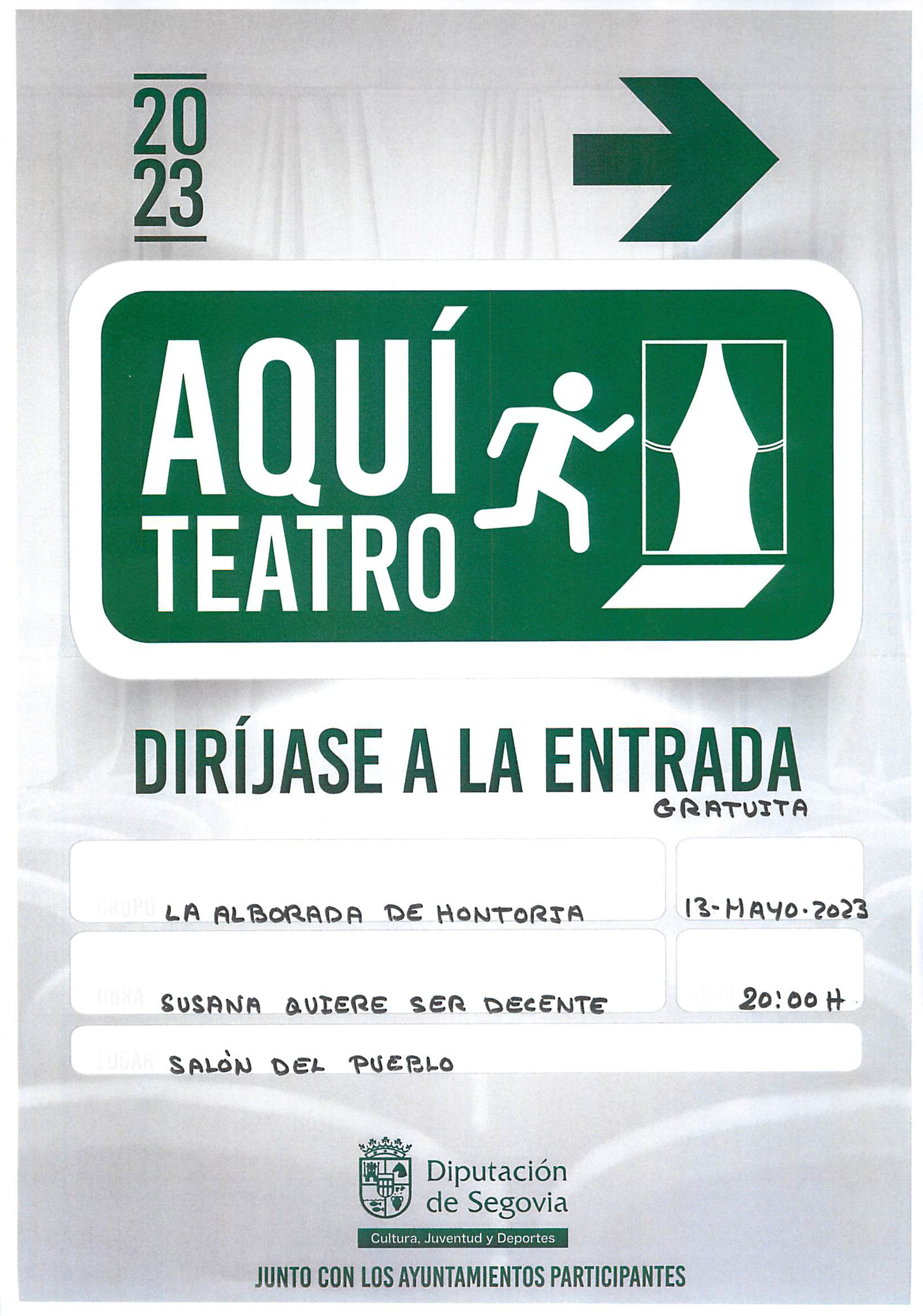 El próximo sábado 13 de mayo de 2023, a las 20:00 horas en el salón del pueblo, tendrá lugar la actuación de la obra SUSANA QUIERE SER DECENTE, interpretada por la Alborada de Hontoria, Esta actuación se celebra por el programa 'Aquí teatro 2023' que organiza la Diputación junto con el Ayuntamiento.