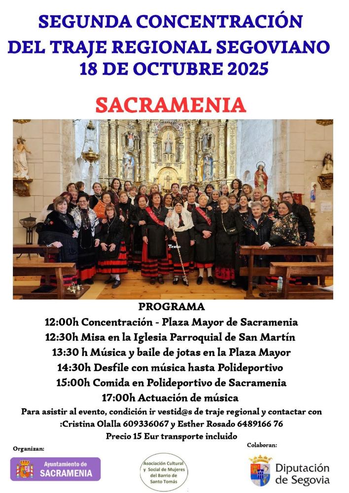 17 octubre 2025La presente edición del encuentro se celebrará mañana, sábado 18 de octubre, en la localidad de Sacramenia. La programación dará comienzo a las doce del mediodía con la tradicional concentración en la Plaza Mayor del municipio para, posteriormente, continuar con una misa en la Iglesia de San Martín. Acto seguido, llegará el turno del desfile de jotas y danzas hasta el Polideportivo, donde los participantes compartirán una comida de hermandad al son de una actuación musical que pondrá fin a la jornada.