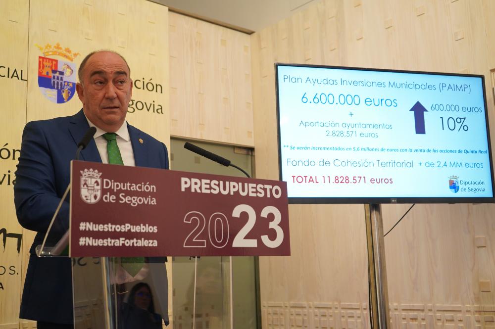 El presidente de la Diputación, Miguel Ángel de Vicente, acompañado del diputado de Hacienda, Óscar Moral, ha presentado esta mañana el Presupuesto de la institución provincial para el año 2023 del que fueron informados ayer los grupos políticos y que trasladará al Pleno el próximo jueves 24 de noviembre. De Vicente ha dado a conocer hoy el presupuesto más alto de la historia de la Diputación de Segovia, que contempla 90.112.000 millones de euros, un 21,88% y 16.179.000 euros más que en 2022. Esta importante subida se debe a que las cuentas contemplan la venta de acciones de la sociedad Quinta Real, una vez ha sido tasada por un valor de 12 millones de euros, “lo que revertirá en un crecimiento exponencial en las inversiones que llegarán en los próximos años a los pueblos de la provincia”. No obstante, y si no se tuviese en cuenta la venta de esas acciones, el presupuesto de la institución provincial para 2023, sería un 6,18% más alto que el del pasado ejercicio. De esta manera, de cada 100 euros del Presupuesto, 46 euros van destinados directamente, en forma de inversión o servicios a los pueblos de la provincia Por eso, tal y como ha señalado el presidente provincial, “en el cuarto Presupuesto que confeccionamos como equipo de Gobierno, venimos de situaciones muy diferentes, pues tuvimos unos presupuestos prudentes y condicionados por la regla de gasto y la estabilidad presupuestaria en 2020, de unas cuentas ambiciosas, pero responsables y honestas con la situación y con las necesidades de la provincia en 2021, y unos presupuestos incrementales en 2022, en los que de cada cuatro euros, uno era de inversión nueva, donde se reforzaba la cooperación y la protección desde unas cuentas elaboradas con lucidez y sensatez; que nos llevan hoy a presentar un presupuesto laborioso en su confección, constructivo por lo que tiene de cohesión territorial, para devolver al medio rural su capacidad de generar oportunidades, valiente porque acomete inversiones pendientes una vez solucionados los problemas que lo impedían, porque crea servicios nuevos y por cuanto continúa avanzando en esas etiquetas de sostenibilidad para nuestro territorio”. Y es que, Miguel Ángel de Vicente tiene claro lo que sí son estos presupuestos, ya que “además, son sociales, porque hacen llegar servicios y recursos para ayudar a solucionar los problemas y cubrir las necesidades de las personas que viven en nuestros pueblos, grandes y pequeños, reforzando la igualdad de oportunidades”, a lo que ha añadido que, por encima de todo, son unas cuentas inversoras, incrementándose en un 92% con respecto a 2022, “con la consolidación del SEPEIS y las infraestructuras que lo albergarán, con un 28% destinado a inversión, más del 20% en los pueblos de la provincia y el resto dedicado a mejorar los servicios que prestamos en ellos o la atención a los más vulnerables”. Pero también está convencido de lo que no son, por lo que ha afirmado que “no son unas cuentas electoralistas, pues suponen una continuidad en lo que veníamos haciendo estos años para afianzar nuestro proyecto de provincia, en una legislatura en la que se ha puesto de manifiesto que el equipo de Gobierno de la Diputación cumple sus compromisos y este presupuesto redondea una gestión de cuatro años hecha con cabeza y responsabilidad, sin grandes proyectos, pero sí con pequeños retos conseguidos”.