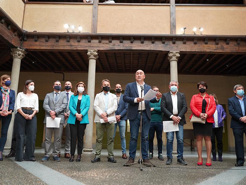 La corporación provincial prácticamente al completo ha escenificado esta mañana en el patio de Columnas de la Diputación el compromiso de la institución con las mujeres de la provincia, en la jornada en la que se conmemora el Día de la Mujer Rural. Para ello, el presidente de la Diputación, Miguel Ángel de Vicente, ha procedido, junto a los tres portavoces de los grupos Popular, Socialista y Mixto, José María Bravo, Máximo San Macario y Ángel Jiménez, a la lectura de un manifiesto redactado para la ocasión, en el que también se ha dado cuenta del relevante papel de la población femenina en la recuperación social y económica que se está tratando de llevar a cabo a raíz de la pandemia en todo el territorio.