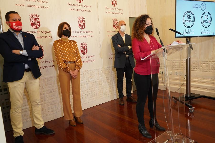 La diputada de Turismo, Magdalena Rodríguez y la diputada de Empleo, Promoción Provincial y Sostenibilidad, Noemí Otero han presentado esta mañana las medidas que, dentro del programa de recuperación socioeconómica de la Diputación, ‘Segovia, provincia Reactiva2' ha puesto en marcha la institución provincial para apoyar a la hostelería y al turismo rural de la provincia. Se trata de 430.000 euros en ayudas directas para dos de los sectores que más están sufriendo a causa de la pandemia y, más de la mitad, 250.000 euros, se destinarán a la concesión de subvenciones directas a los empresarios del sector para hacer frente a los gastos ordinarios de sus negocios. Las diputadas han estado acompañadas en esta comparecencia por el presidente de HOTUSE, Jesús Castellanos y su homólogo en la Asociación de Turismo Rural de Segovia, Gerardo Otero, quienes han tenido un papel activo a la hora de consensuar muchas de las medidas que se van a llevar a cabo.