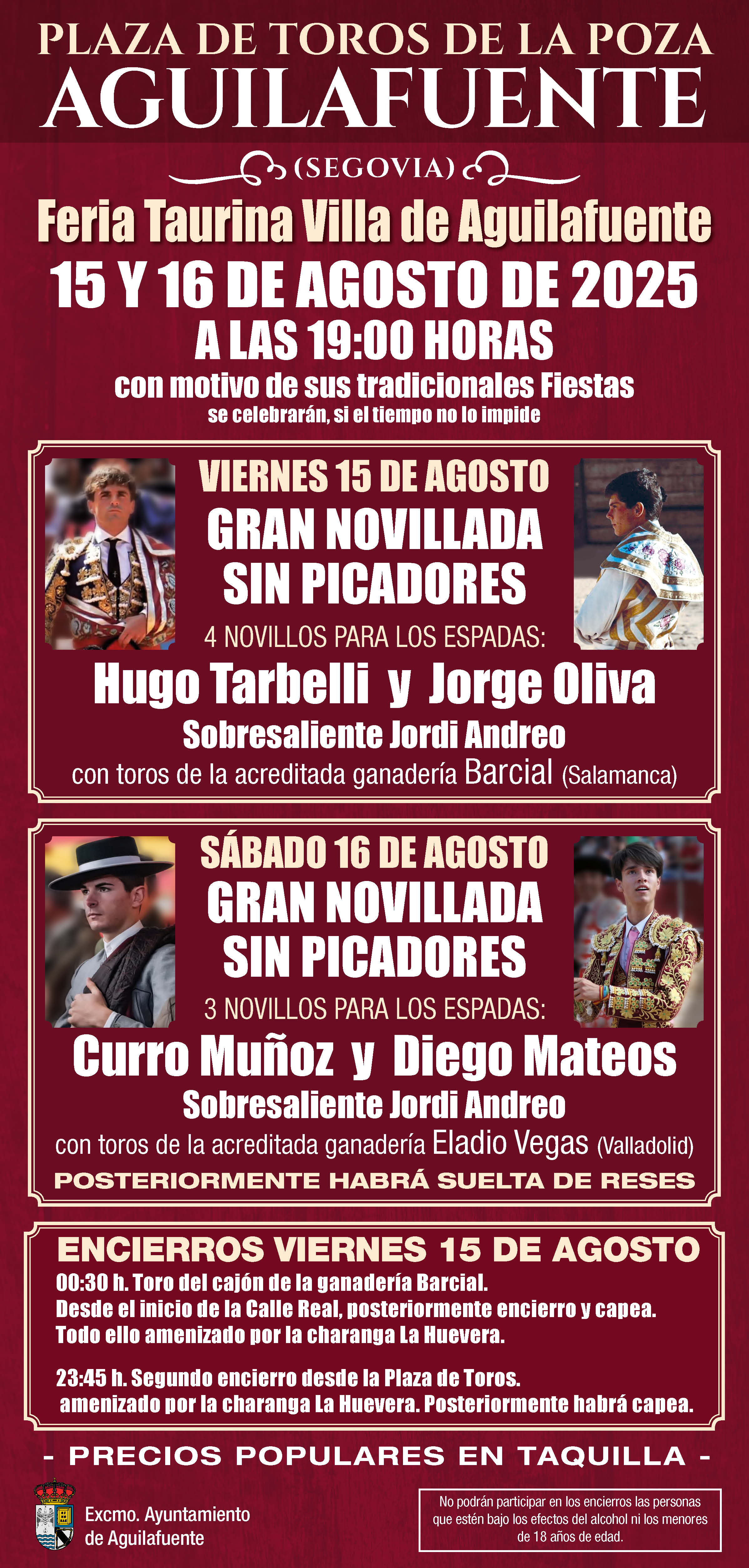 Programación taurina Fiestas en Honor a la Virgen de la Asunción 2025 Programación taurina Fiestas en Honor a la Virgen de la Asunción 2025 NOTA: EN EL DÍA 16 HAY UN ERROR. SE LIDIARÁN 4 NOVILLOS EN LUGAR DE LOS 3 QUE APARECEN EN EL CARTEL. Documentos Cartel Toros Aguilafuente 2025.pdf (pdf 228,6 kB)