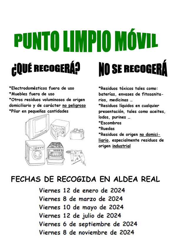 PUNTO LIMPIO MÓVIL PUNTO LIMPIO MÓVIL Este servicio tiene como objetivo facilitar al usuario el depósito selectivo de residuos voluminosos (electrodomésticos, muebles, etc) los cuales no pueden depositarse en los contenedores de basura normales. Documentos Díptico Punto Limpio Móvil 2024.pdf (pdf 125,2 kB)