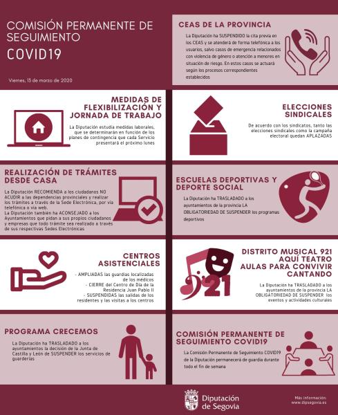 Por tercer día consecutivo, la Comisión Permanente de Seguimiento COVID-19 de la Diputación de Segovia se ha reunido, con el objetivo de revisar y evaluar las medidas adoptadas estos días, así como de continuar analizando la situación y de tomar nuevas decisiones vinculadas a las medidas de prevención respecto a la crisis sanitaria originada por el conocido como Coronavirus.