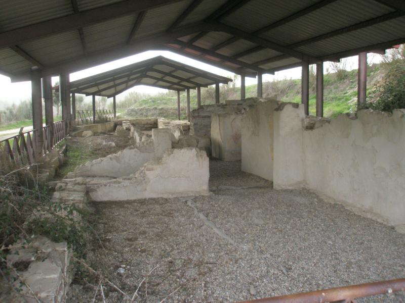 El edificio se conserva de forma parcial. Destaca el muro norte, construido en piedra hasta una altura cercana a los dos metros debido a su función de contención. Además, se han documentado varios zócalos, fabricados en el mismo material y sobre los cuales apoyaría la estructura de lienzos realizados en adobe o tapial. Completa el conjunto la secuencia de muretes bajos intercalados con basas calizas que delimitaban el peristilo, así como algunos de los elementos sustentantes que permanecen sin alterar la posición en la que fueron hallados.