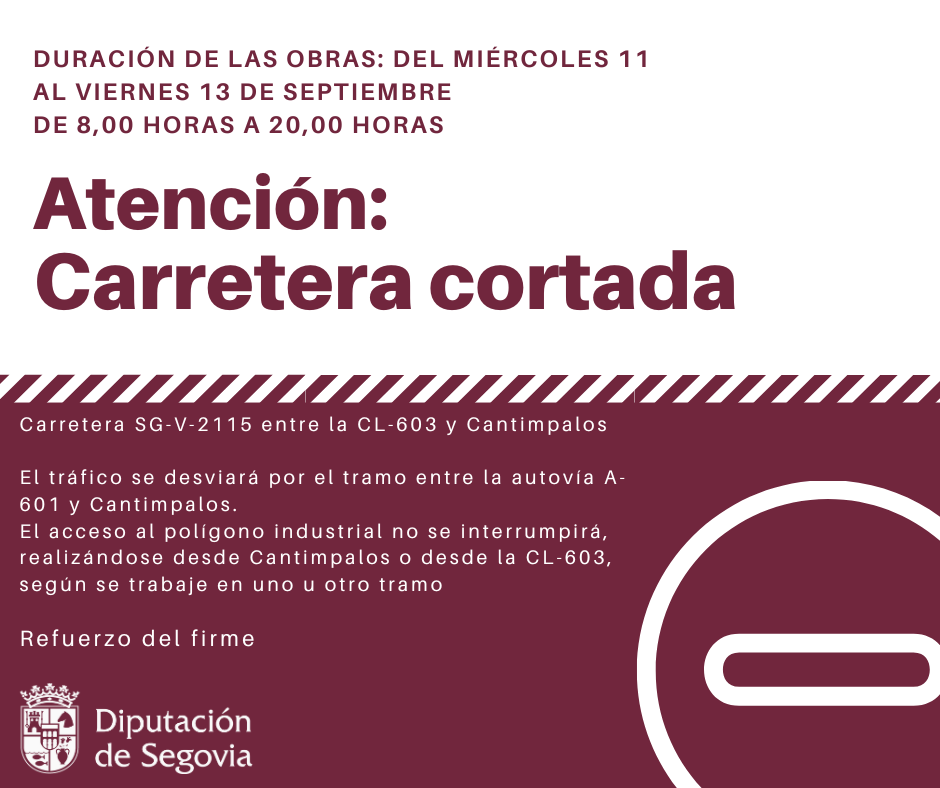 La Diputación de Segovia va a realizar las obras de refuerzo del firme en la SG-V-2115 entre la CL-603 y Cantimpalos, lo que obligará a cortar el tráfico en este tramo del miércoles 11 al viernes 13 de septiembre, en horario de ocho de la mañana a ocho de la tarde, permaneciendo abierta la circulación por las noches.