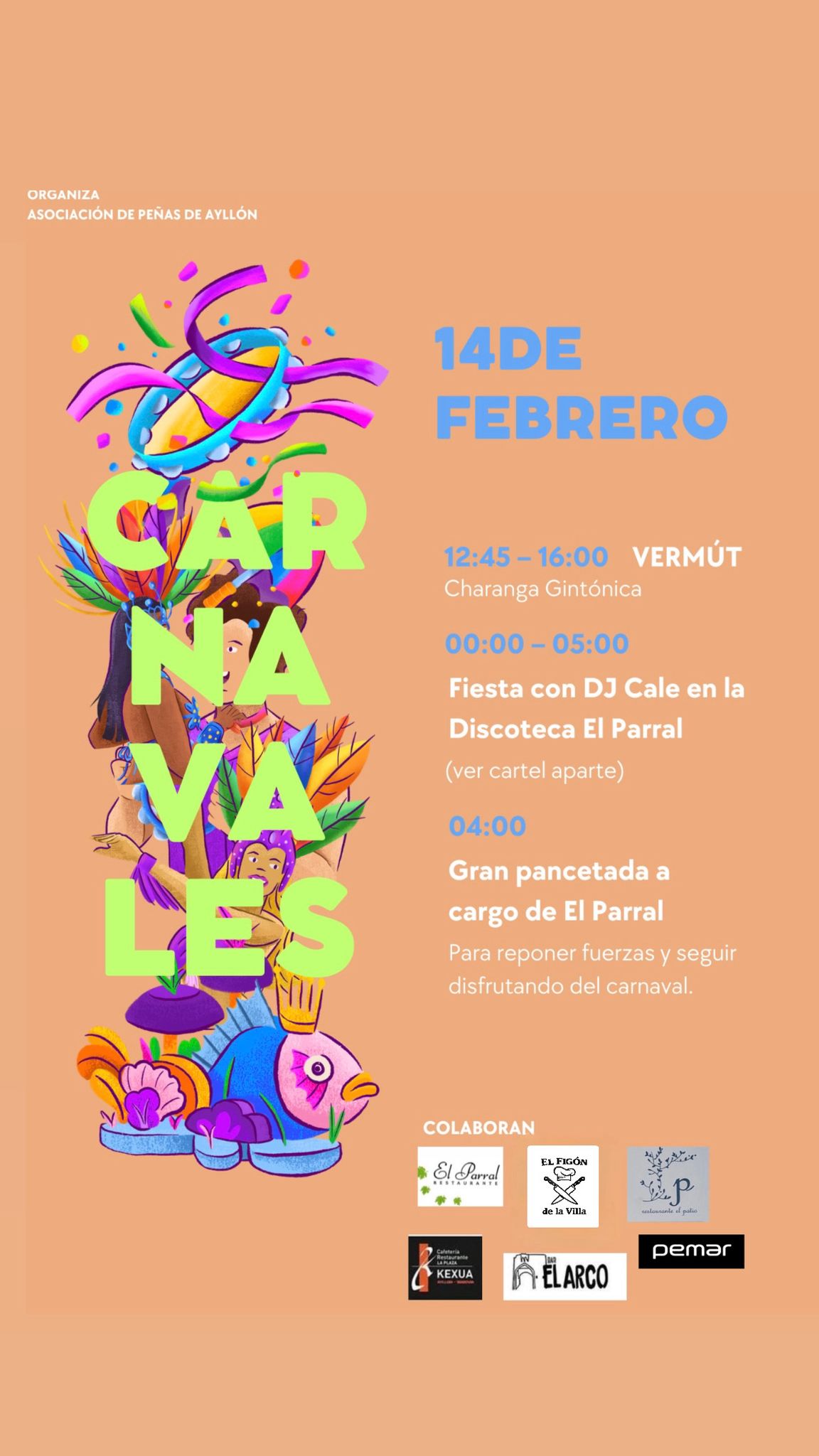 CARNAVAL Y CONCURSO DE DISFRACES. "Y que el silencio se convierta en Carnaval". El próximo sábado 14 de febrero se desarrollarán diversas actividades con motivo de los Carnavales: - A las 12.45 h., la Asociación de Peñas de Ayllón convoca a un vermú con charanga que se prolongará hasta las 16 h. - A partir de las 18.30 h., organizado por el Ayuntamiento y el Grupo de Danzas de Ayllón concurso de disfraces en la Plaza Mayor. Se valorará la originalidad, el que estén hechos por los propios participantes y la puesta en escena. Después se ofrecerá una merienda-cena con panceta - A partir de las 00:00 h, organizada también por la Asociación de Peñas, fiesta con DJ Cale en la discoteca El Parral #CARNAVAL #penas #ayllon #ASOCIACIONDEPEÑAS
