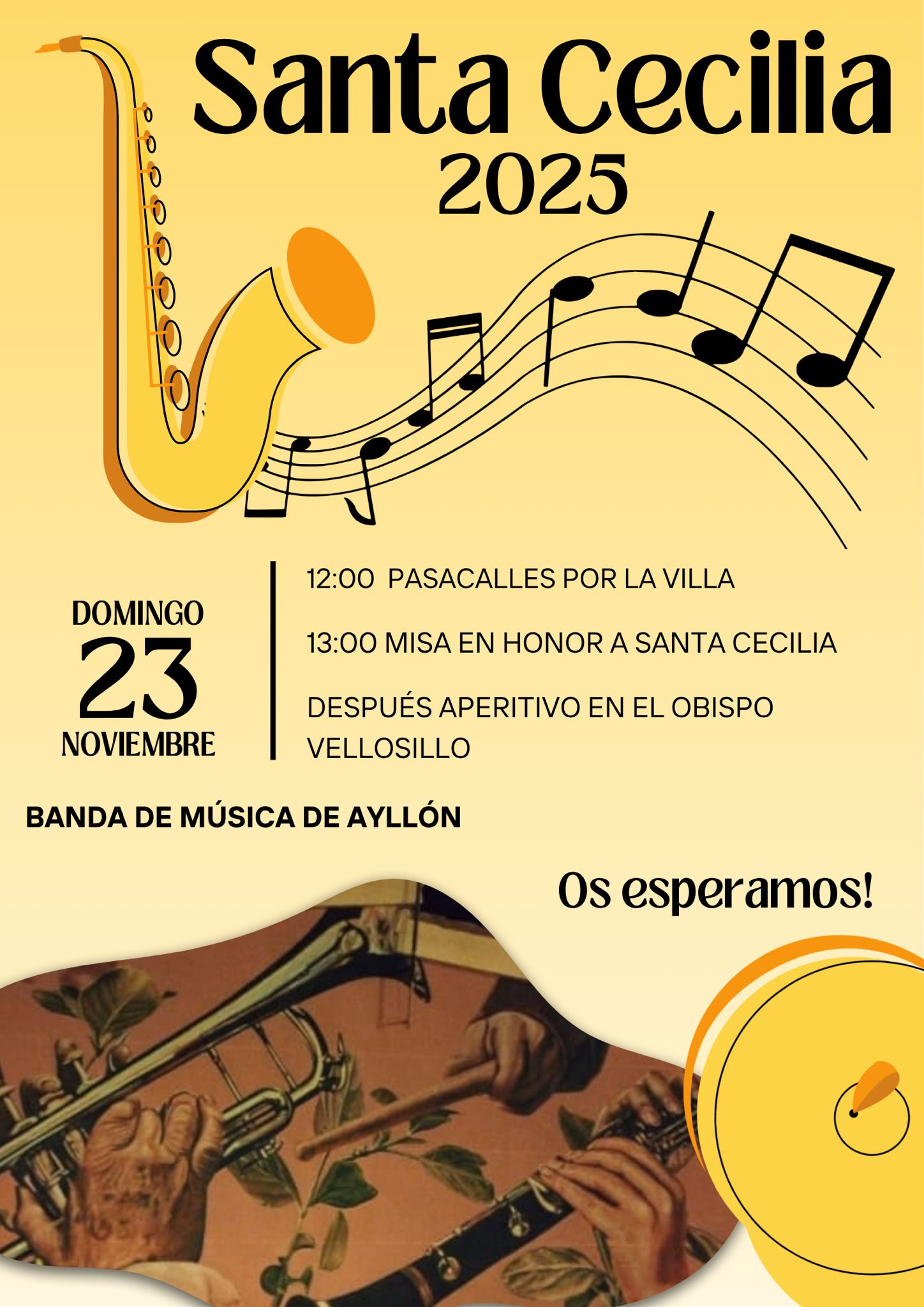 Santa Cecilia 2025. Banda de Música de Ayllón. Domingo 23 de noviembre. - 12:00h Pasacalles por la villa. - 13:00h Misa en honor a Santa Cecilia. Después aperitivo en el Palacio del Obispo Vellosillo. Te esperamos