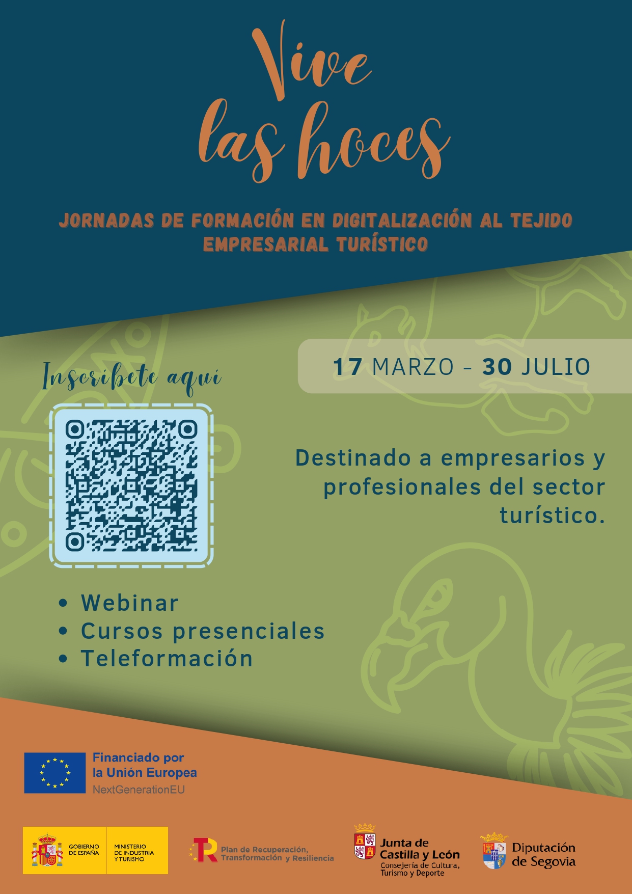 • Formaciones incluidas en las Jornadas de formación en digitalización al tejido empresarial turístico, incluidas en el Plan de Sostenibilidad Turística en Destino HOCES DE SEGOVIA, con cargo al "Plan de Recuperación, Transformación y Resiliencia, financiadas por la Unión Europea-NEXTGENERATION EU