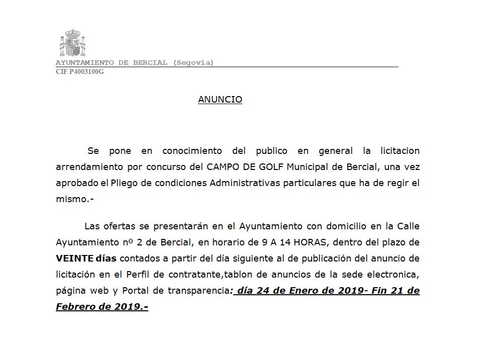 ANUNCIO DE LICITACIÓN DEL ARRENDAMIENTO DEL CAMPO DE GOLF MUNICIPAL Licitación del arrendamiento del campo de golf municipal, aprobado el pliego de condiciones que ha de regir el mismo , por concurso. Plazo de presentación de ofertas: desde el día 25 de enero al 21 de febrero de 2019. Documentos ANUNCIO CAMPO GOLF.doc (doc 57,5 kB)PLIEGO DE CLÁUSULAS ADMINISTRATIVAS PARTICULARES.docx (docx 37,3 kB)