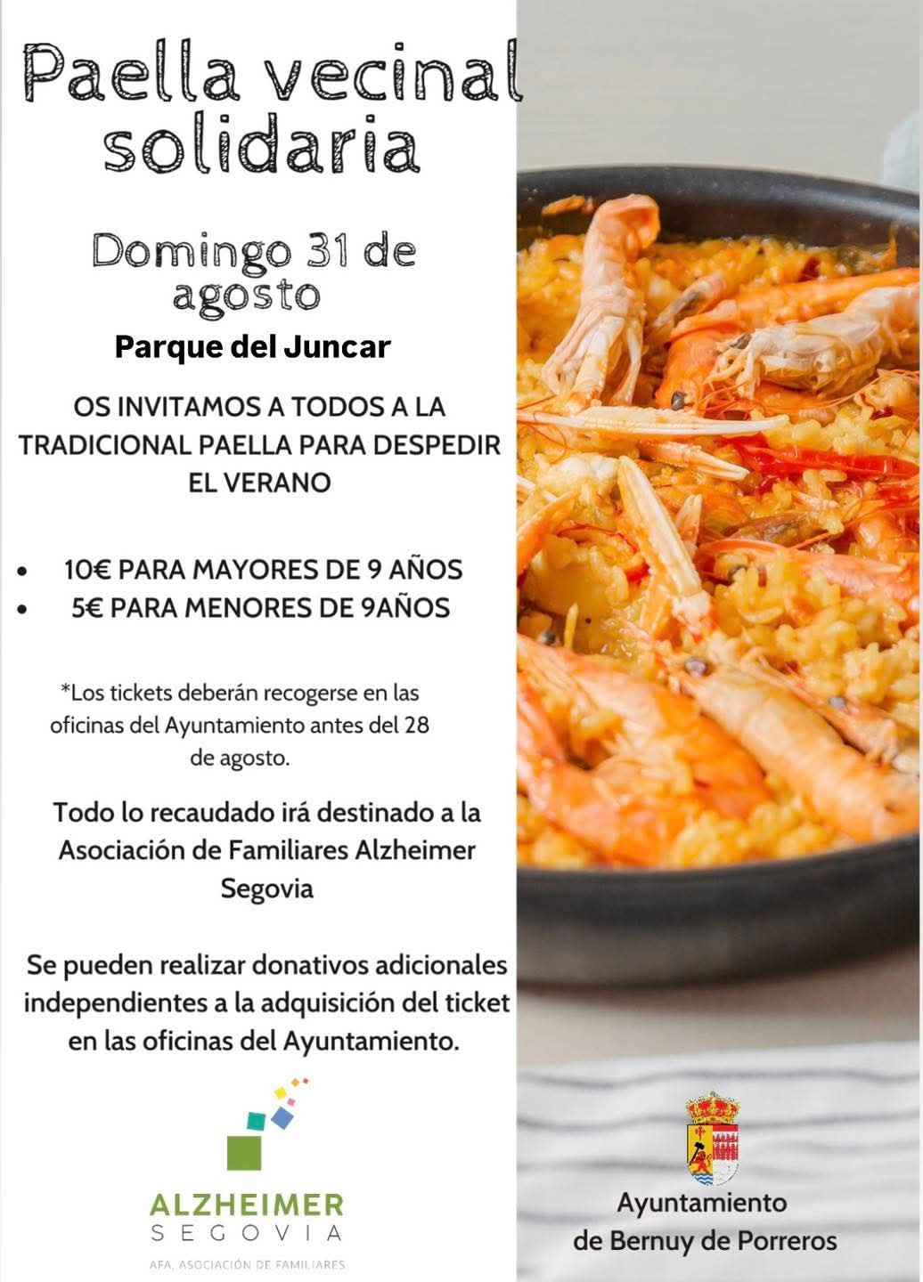 El domingo 31 de agosto, a las 15:00 tendrá lugar en el Juncar la paella vecinal solidaria de este 2025, que se realizará en favor de Afa Segovia