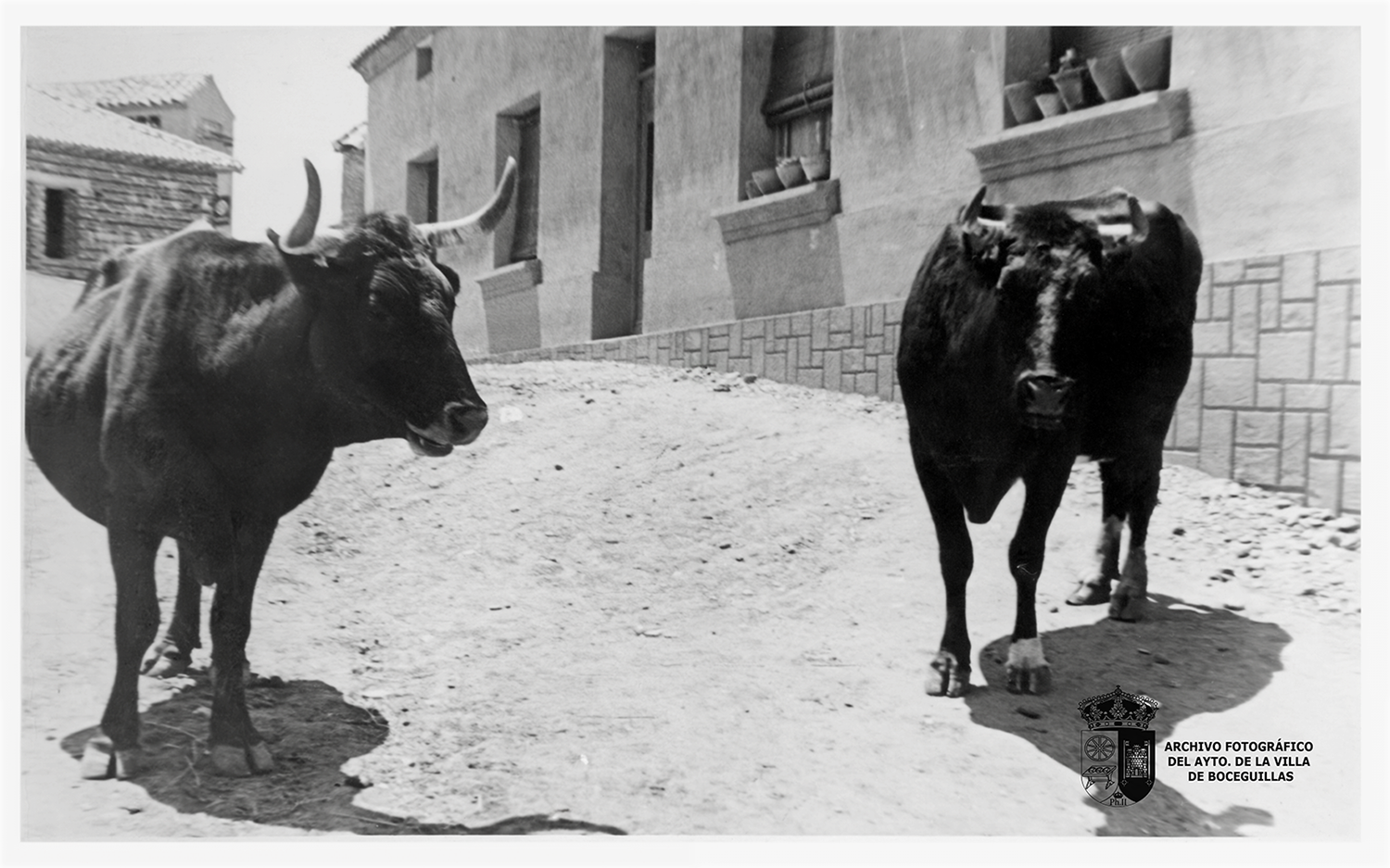 - Las vacas de la familia Sanz González en la calle Miguel LLabrés. Esta raza se sustituyó poco después por la vaca suiza (manchas blancas y negras). Imagen cedida por la familia Sanz González