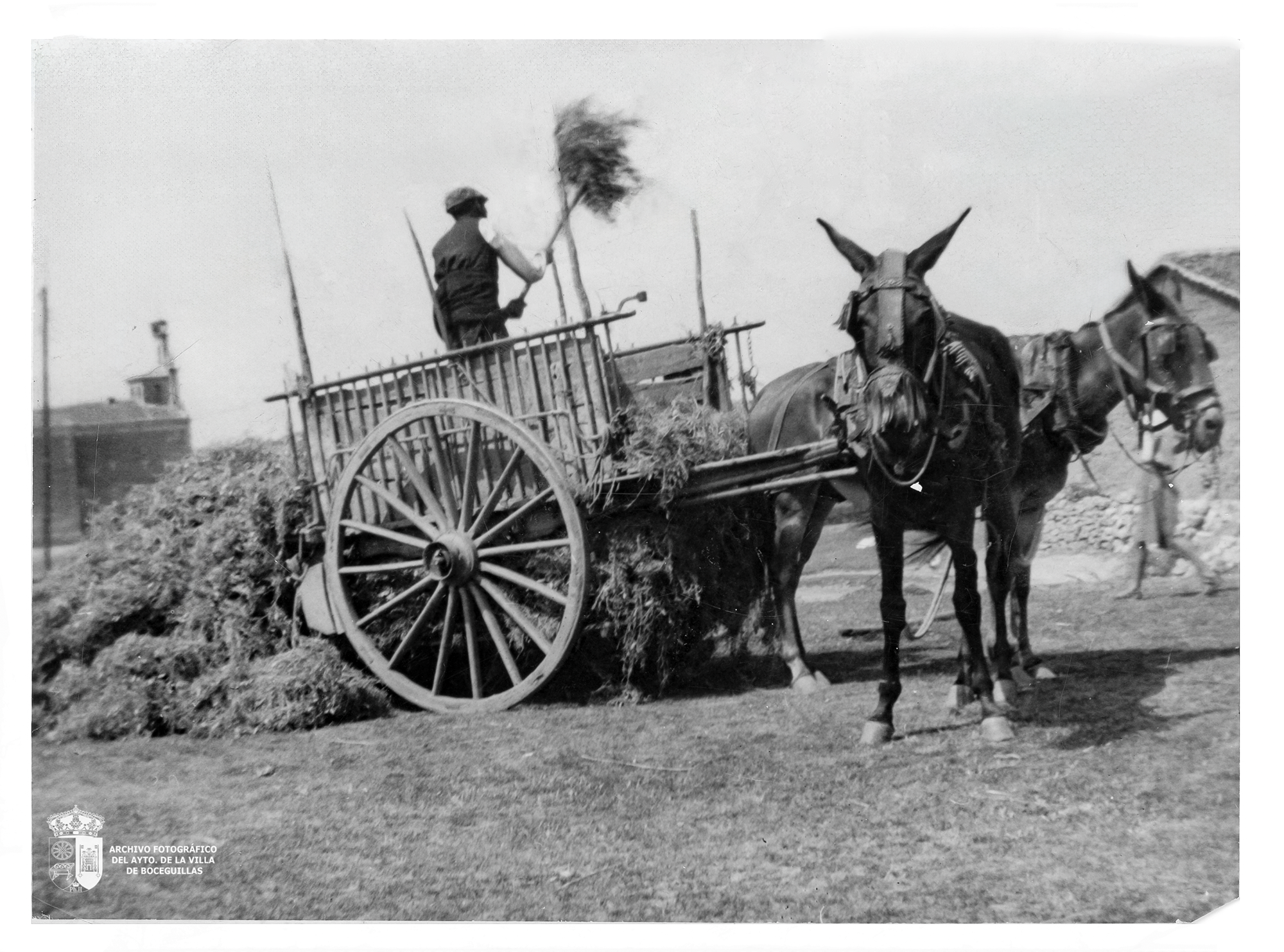 - Antonio Estebaranz Casado en la plaza de Oriente, en las heras. Los caballos son Lucero y Segoviano, los mejores machos del pueblo. Imagen cedida por Luis Estebaranz Sanz