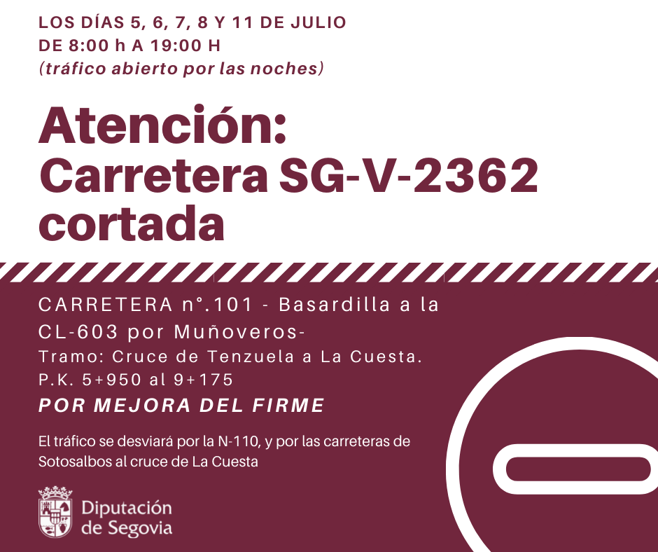 Los trabajos afectarán a los puntos kilométricos entre el 5+950 y el 9+175 y, para su correcta consecución, la institución provincial se verá obligada a cortar el tráfico en esta zona durante los días 5, 6, 7, 8 y 11 de julio entre las 8:00 horas y las 19:00 horas, quedando la vía abierta al paso de vehículos durante las noches de estas jornadas. Como es habitual en estos casos, los cortes serán debidamente señalizados y el tráfico será desviado, en esta ocasión, tanto por la N-110 como por las carreteras de Sotosalbos al cruce de La Cuesta.