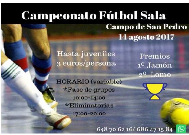 CAMPEONATO DE FÚTBOL SALA CAMPEONATO DE FÚTBOL SALA Aquí os dejamos el cartel del Campeonato de fútbol sala. Será el 14 de agosto en Campo de San Pedro. Documentos CAMPEONATO DE FUTBOL.pdf (pdf 53,8 kB) Galería imágenes Fútbol Sala