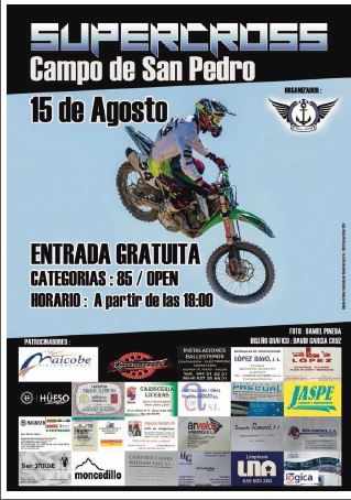 SUPERCROSS SUPERCROSS El sábado 15 de agosto ven a disfrutar del SUPERCROSS a Campo de San Pedro. Documentos CAMPEONATO MOTOCROSS.pdf (pdf 108,4 kB) Galería imágenes SUPERCROSS