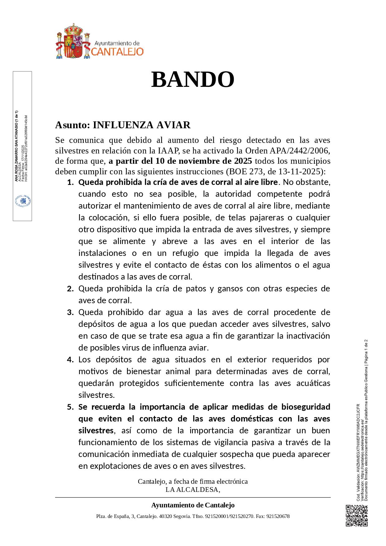 Se comunica que debido al aumento del riesgo detectado en las aves silvestres en relación con la IAAP, se ha activado la Orden APA/2442/2006, de forma que, a partir del 10 de noviembre de 2025 todos los municipios deben cumplir con las siguientes instrucciones (BOE 273, de 13-11-2025):