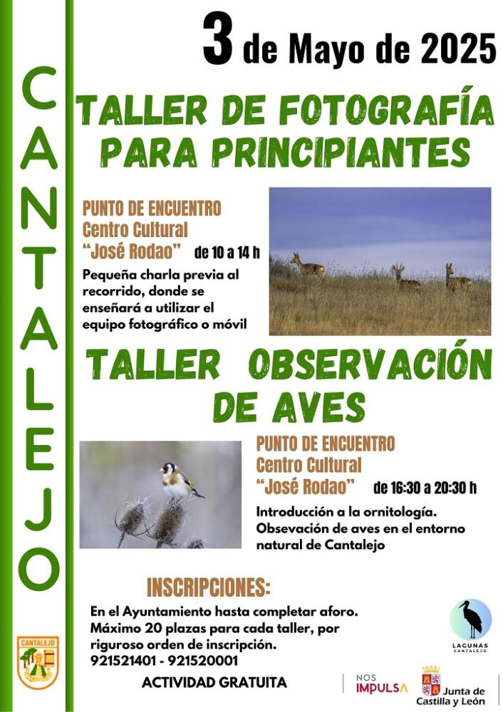 El 3 de mayo se impartirán 2 talleres: un taller de fotografía para principiantes de 10 a 14 h y un taller de observación de aves de 16:30 a 20:30 h.