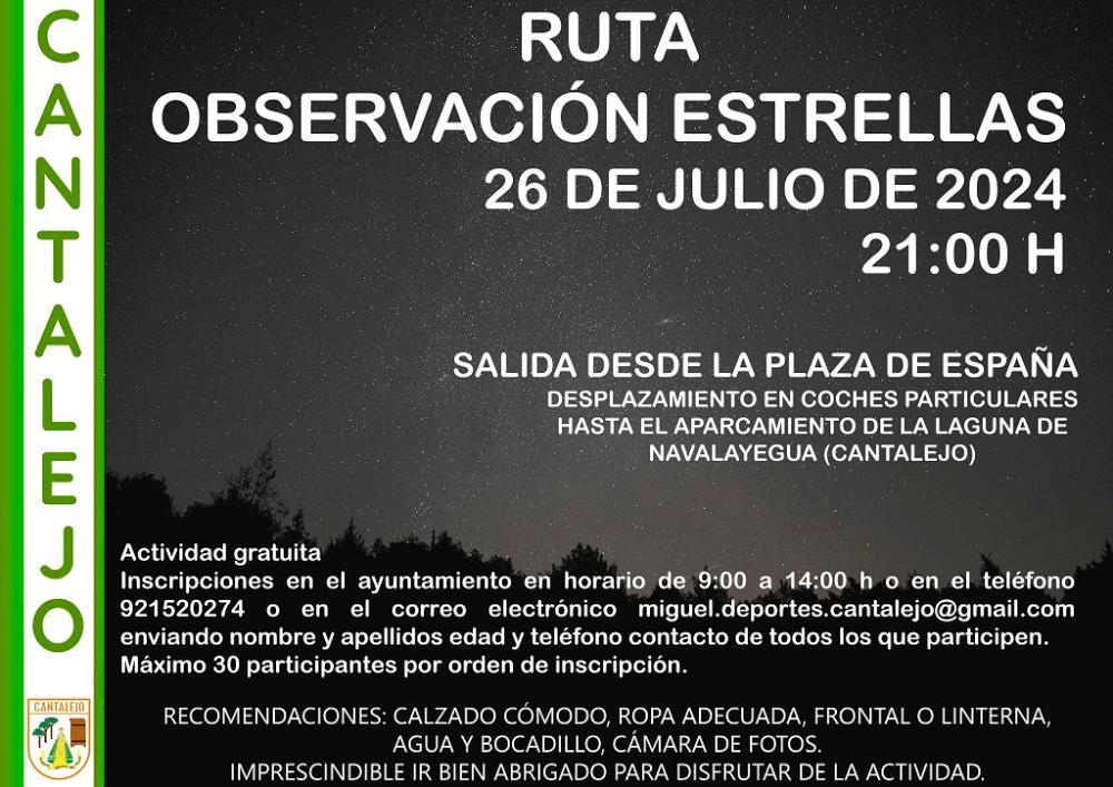 RUTA NOCTURNA interpretada por las Lagunas de Cantalejo. Máximo 30 personas. Longitud 3 km, Para todas las edades. Inscripciones en el Ayuntamiento de Cantalejo. Punto de encuentro aparcamiento de NAVALAYEGUA.