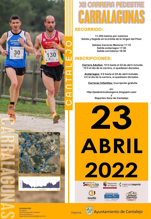 El 23 de abril se celebra la XII carrera pedestre y marcha andariegos Carralagunas, evento deportivo organIzado por el Ayuntamiento de Cantalejo e incluido en el circuito de carreras pedestres de la provincia de Segovia.
