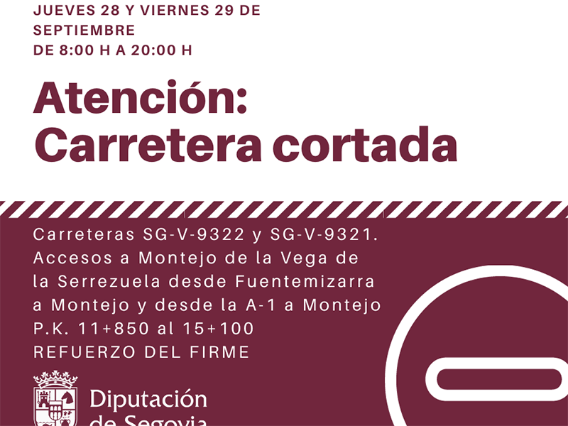 En este caso, las obras, que afectarán a los puntos kilométricos del 11+850 al 15+100 ubicados en el tramo entre Montejo de la Vega de la Serrezuela y el límite de la provincia de Burgos, obligarán a la Diputación a realizar cortes de tráfico los días 28 y 29 de septiembre en los accesos al municipio desde las carreteras SG-V-9322, de Fuentemizarra a Montejo de la Vega de la Serrezuela, y SG-V-9321, desde la A-1 hasta Montejo de la Vega de la Serrezuela. En estos puntos, la circulación se verá interrumpida entre las 8:00 horas y las 20:00 horas, siendo desviada por la A-1 y los caminos que comunican la localidad segoviana con la burgalesa Milagros, y quedando la carretera abierta al tráfico durante las noches.