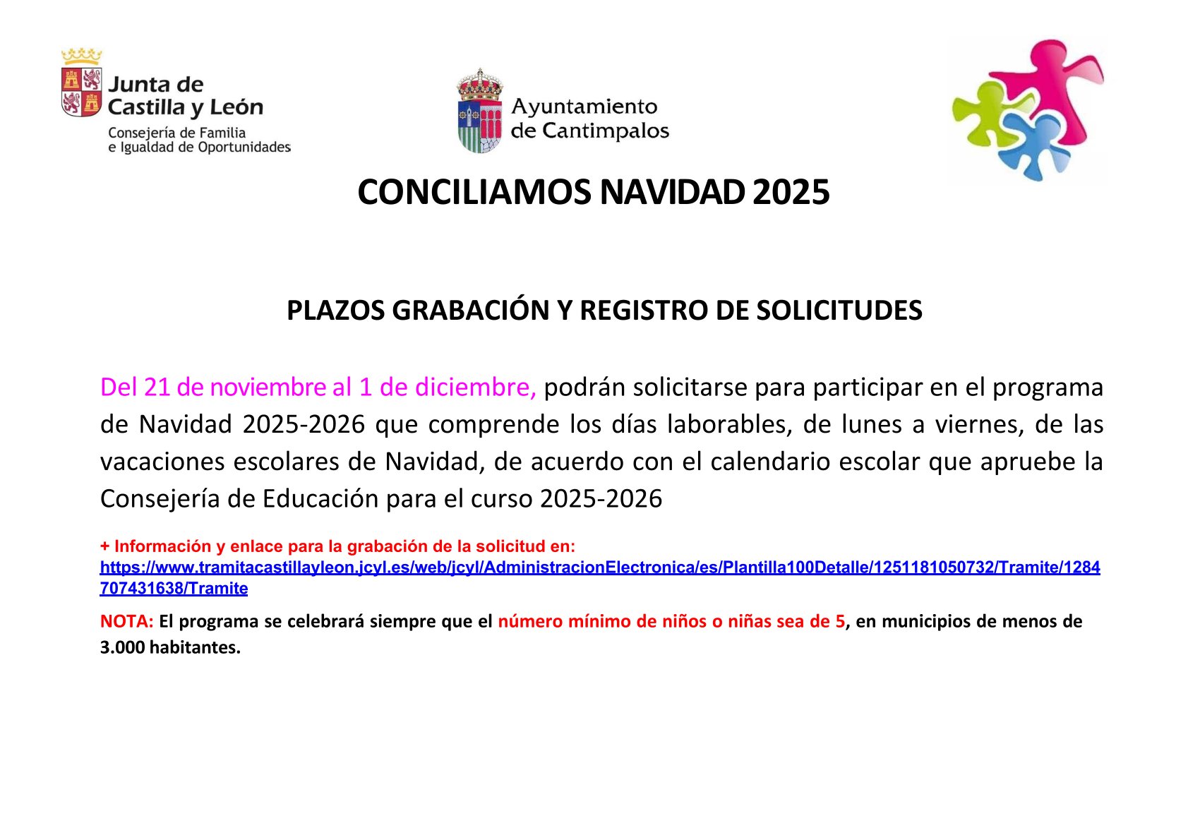 - Del 21 de noviembre a 1 de diciembre, podrán solicitarse para participar en días laborables, de lunes a viernes, de las vacaciones escolares de Navidad, de acuerdo con el calendario escolar que apruebe la Consejería de Educación para el curso 2025-2026.