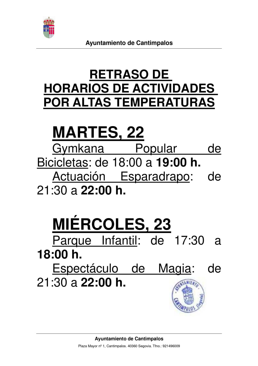 RETRASO ACTIVIDADES por ALTA TEMPERATURA RETRASO DE ACTIVIDADES MARTES 22: - Gimkana popular de bicicletas: de 18:00 a 19:00 - Actuación Esparadrapo: de 21:30 a 22:00 MIERCOLES: - Parque Infantil: de 17:30 a 18:00 - Espectáculo de Magia: de 21:30 a 22:00