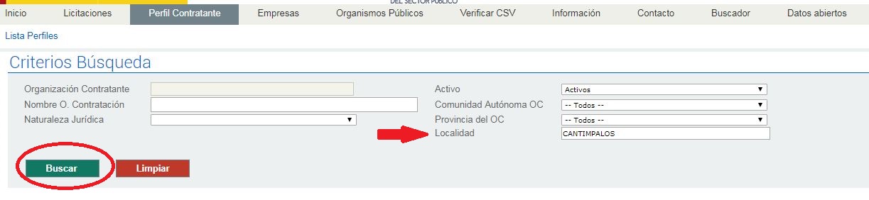En el formulario de búsqueda de Perfil del Contratante, en el campo Localidad escribir "Cantimpalos" tal y como muestra la imagen adjunta (click para aumentar), seguido de click en el botón Buscar.