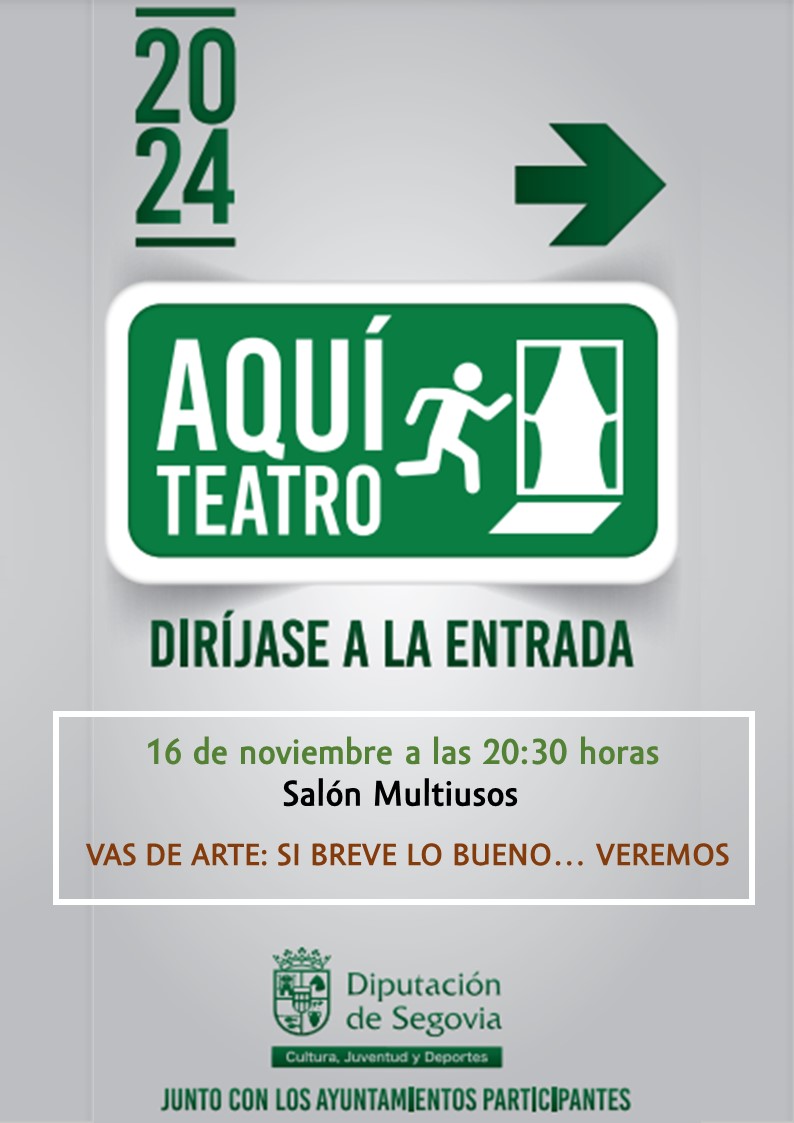 AQUI TEATRO: 16 DE NOVIEMBRE AQUI TEATRO: 16 DE NOVIEMBRE PROGRAMA AQUI TEATRO 2024 16 de noviembre a las 20:30 Salón multiusos, Carrascal del Río. VAS DE ARTE: SI BREVE LO BUENO...VEREMOS