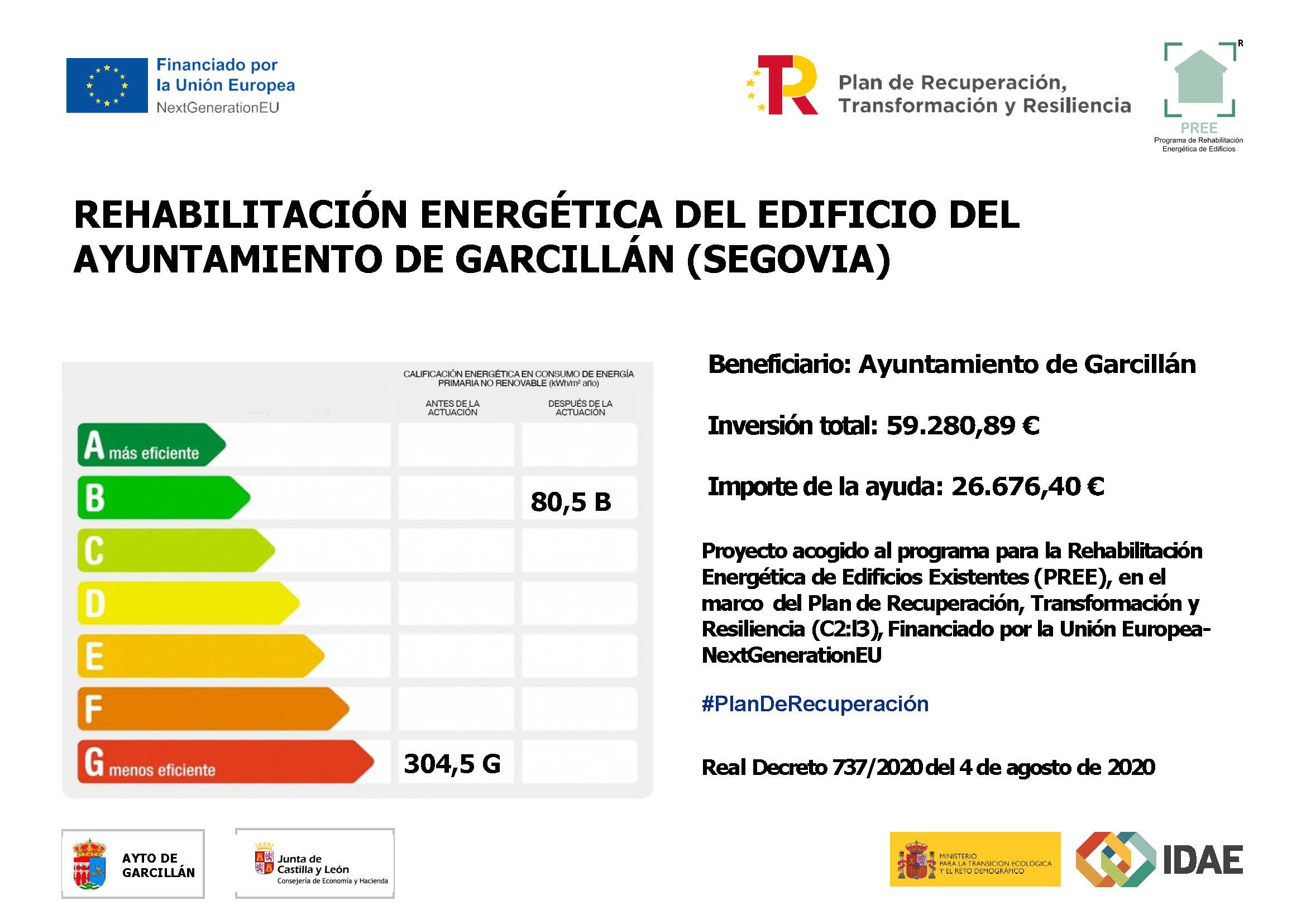 Esta Entidad ejecutará obras de Rehabilitación Energética del edificio del Ayuntamiento de Garcillán (Segovia) dentro de la línea de ayuda en el marco del Plan de Recuperación, Transformación y Resilencia (PRTR), consistentes en mejorar la envolvente térmica del mismo.