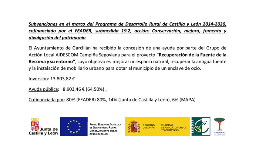 El Ayuntamiento de Garcillán ha recibido la concesión de una ayuda por parte del Grupo de Acción Local AIDESCOM Campiña Segoviana para el proyecto “Recuperación de la Fuente de la Recorva y su entorno”, cuyo objetivo es  mejorar un espacio natural, recuperar la antigua fuente y la instalación de mobiliario urbano para dotar al municipio de un enclave de ocio.