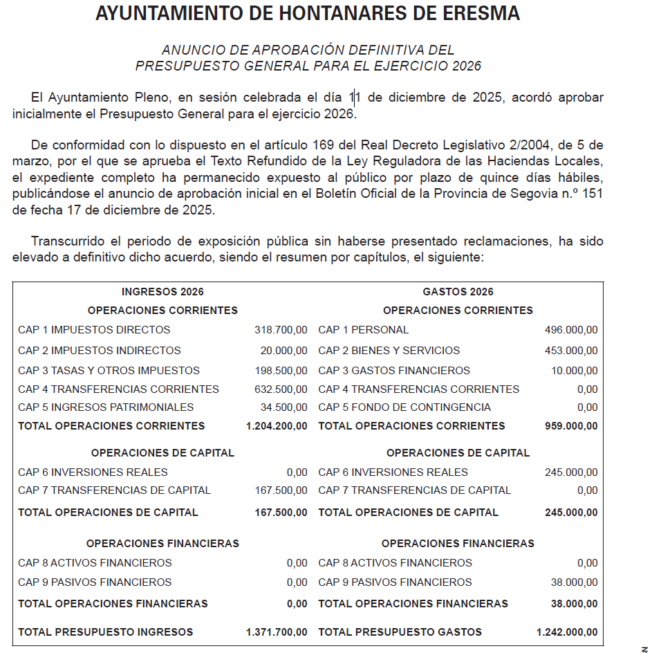 ANUNCIO DE APROBACIÓN DEFINITIVA DEL PRESUPUESTO GENERAL PARA EL EJERCICIO 2026 Documentos 20260123_RC_604_Hontanares_de_Eresma_BOP_SEGOVIA_10_23_1_26.pdf (pdf 226,3 kB)