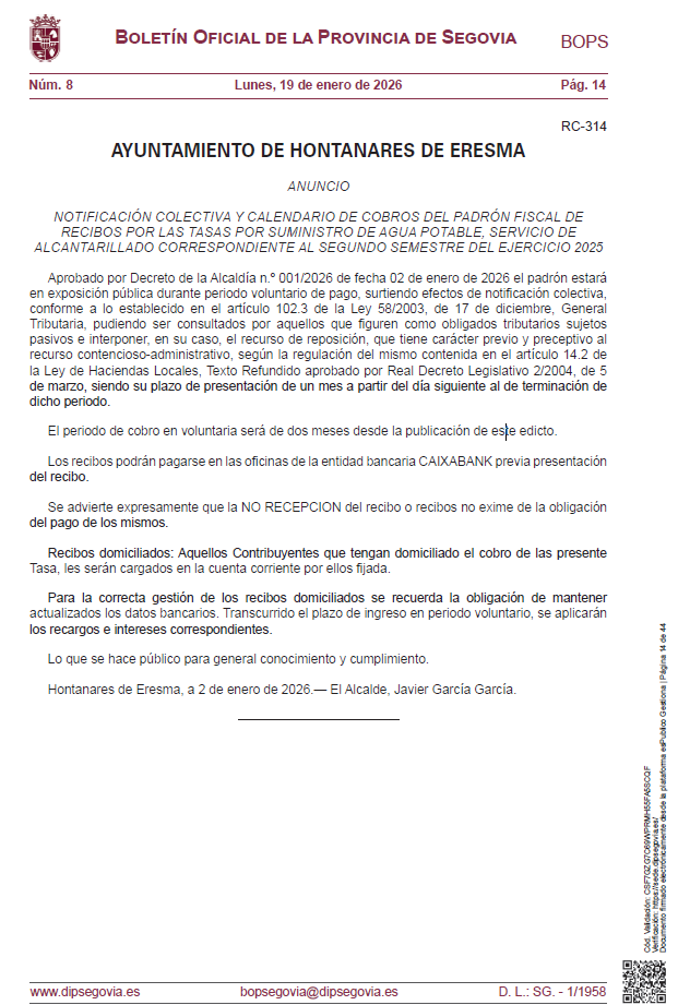 NOTIFICACIÓN CALENDARIO RECAUDACIÓN Documentos 20260119_RC-314_Hontanares_20260116_Publicacion_BOP_SEGOVIA_8_19_1_26.pdf (pdf 128,4 kB)