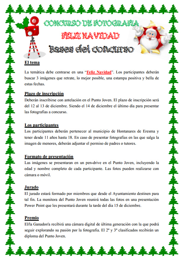 Concurso Fotográfico Navideño del Punto Joven Concurso Fotográfico Navideño del Punto Joven Para ver las bases del Concurso de Fotografía 2016 haga click en la imagen y si prefiere descargar el pdf pinche en el siguiente enlace: Documentos ConcursoFotoJoven2016.pdf (pdf 433,4 kB)