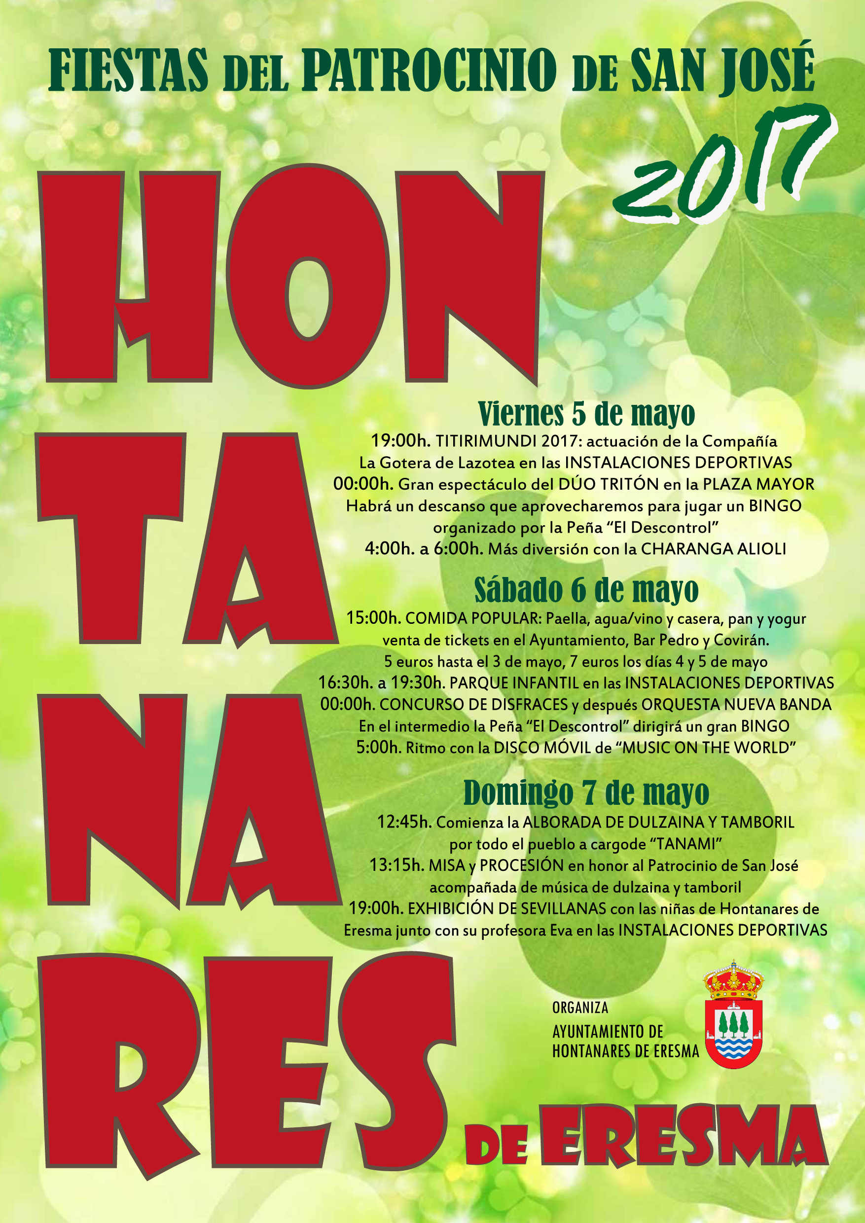 Del 5 al 7 de mayo se celebrarán en Hontanares de Eresma las Fiestas del Patrocinio en honor a San José 2017. Para ver el cartel con el programa de festejos preparado por la Concejalía de Fiestas incluido, haga click en la imagen.