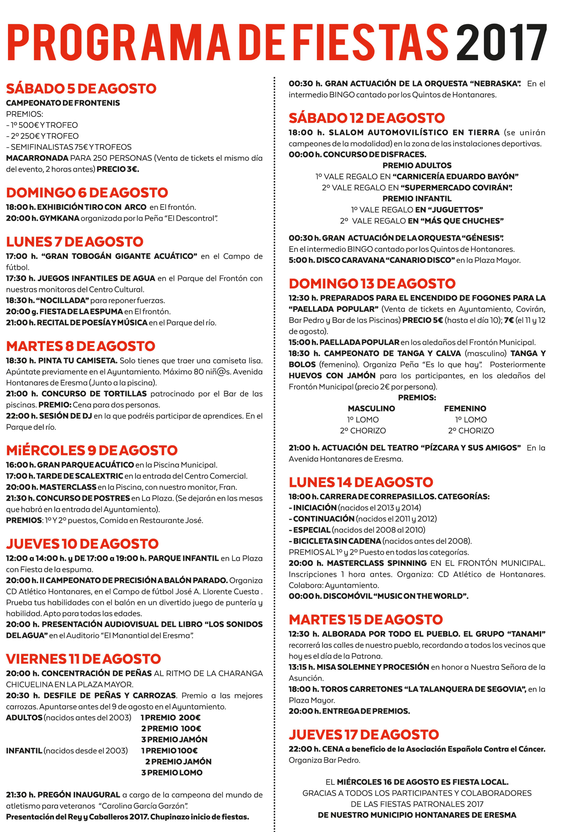 Programa de las Fiestas de la Asunción 2017 Programa de las Fiestas de la Asunción 2017 Programa de Actividades para las Fiestas de la Asunción del 7 al 15 de agosto de 2017. ¡Felices Fiestas, hontanariegos! Documentos Programa_Fiestas_Hontanares_2017 (pdf 6,7 MB)