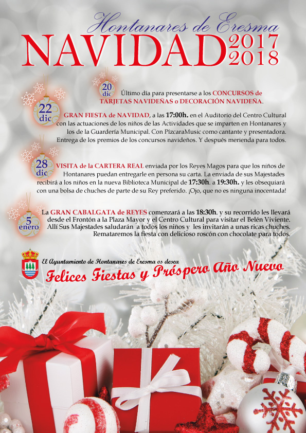 20 diciembre - Último día para presentarse a los CONCURSOS de TARJETAS NAVIDEÑAS o DECORACIÓN NAVIDEÑA. 22 diciembre - GRAN FIESTA DE NAVIDAD, desde las 17:00 horas en el Auditorio del Centro Cultural con las actuaciones de los niños de alguna de las Actividades que se imparten en Hontanares y de los niños que están en la Guardería Municipal. Con PízcaraMusic como cantante y presentadora. Durante el espectáculo se hará entrega de los premios correspondientes a los concursos navideños. Y después merienda para todos. 28 diciembre - Los más pequeños reciben este año la visita de una Cartera Real enviada por los mismísimos Reyes Magos para que los niños de Hontanares puedan entregarle en persona su carta. La enviada de sus Majestades recibirá a los niños en la nueva Biblioteca Municipal de 17:30h. a 19:30h. y les obsequiará con una bolsa de chuches de parte de su Rey preferido. ¡Ojo, que no es ninguna inocentada! 5 enero - La GRAN CABALGATA DE REYES comenzará a las 18:30h. su recorrido desde la entrada del pueblo junto al puente, pasando por la Plaza Mayor, donde continuarán hasta el Centro Cultural donde visitarán el Belén Viviente. La comitiva, un año más, recibirá uno a uno a todos los niños (y adultos) que lo deseen y les invitarán a unas ricas chuches. Remataremos la fiesta, delicioso roscón con chocolate para todos