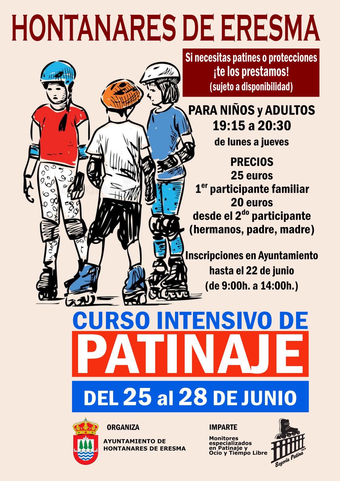 Del lunes 25 al jueves 28 de junio. Horario 19:15h. a 20:30h. Para niños y adultos.Si necesitas patines o protecciones ¡te los prestamos! (sujeto a disponibilidad) PRECIOS: 25 euros (1er participante familiar) 20 euros desde el 2do participante (hermanos, padre, madre) Inscripciones en Ayuntamiento hasta el 22 de junio (de 9:00h. a 14:00h.)