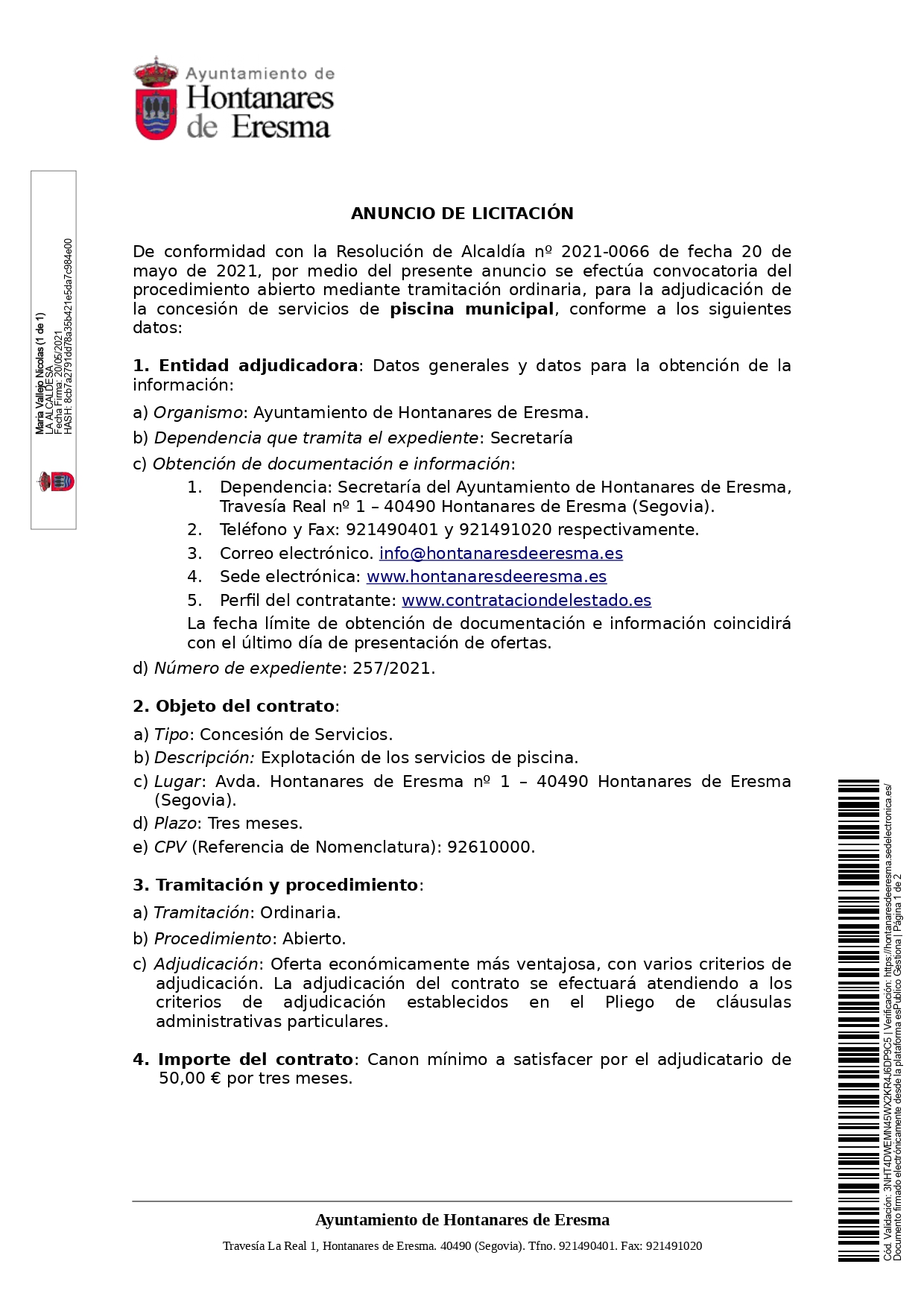 De conformidad con la Resolución de Alcaldía nº 2021-0066 de fecha 20 de mayo de 2021, por medio del presente anuncio se efectúa convocatoria del procedimiento abierto mediante tramitación ordinaria, para la adjudicación de la concesión de servicios de piscina municipal