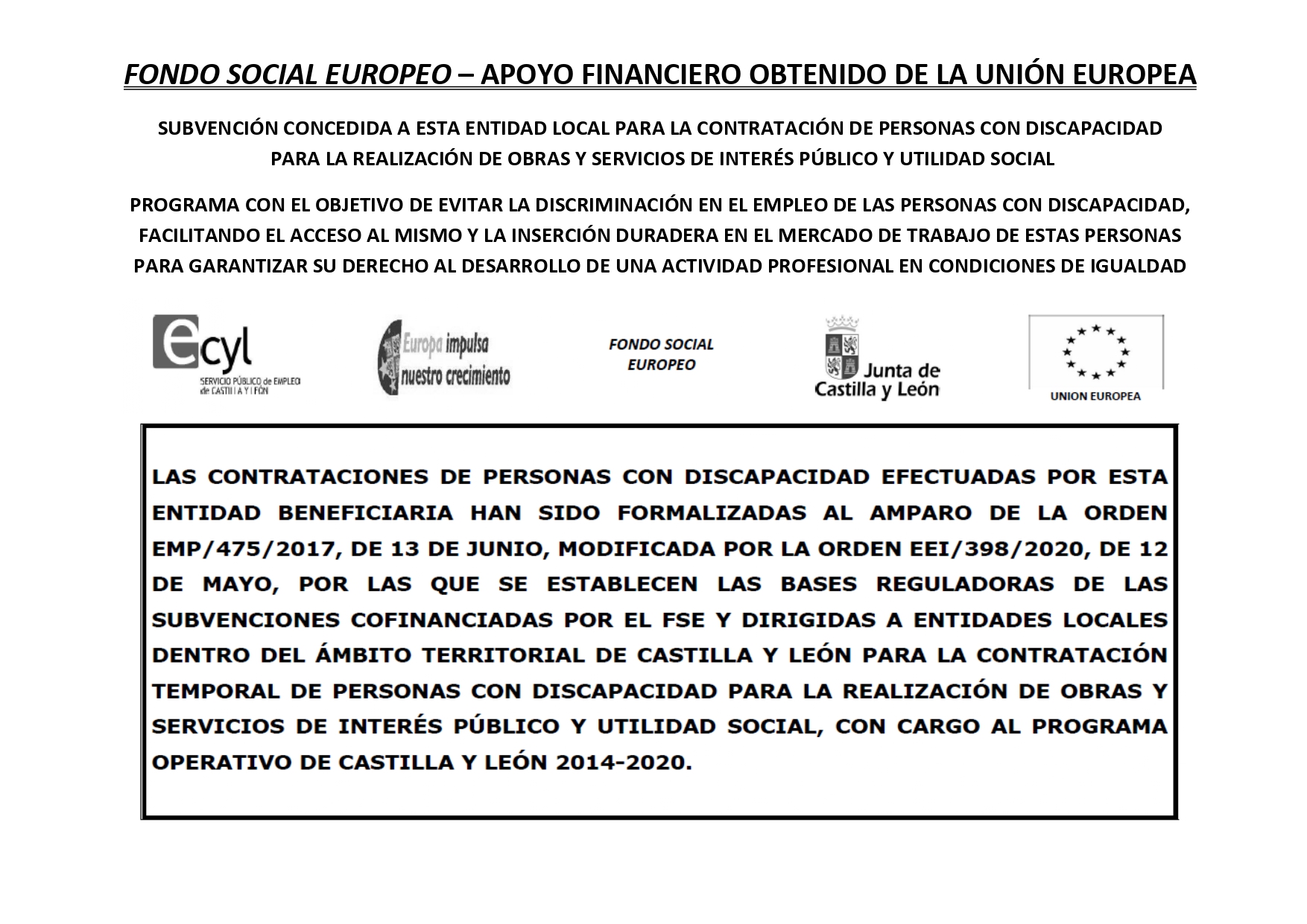 FONDO SOCIAL EUROPEO – APOYO FINANCIERO OBTENIDO DE LA UNIÓN EUROPEA SUBVENCIÓN CONCEDIDA AL AYUNTAMIENTO DE HONTANARES DE ERESMA PARA LA CONTRATACIÓN DE PERSONAS CON DISCAPACIDAD PARA LA REALIZACIÓN DE OBRAS Y SERVICIOS DE INTERÉS PÚBLICO Y UTILIDAD SOCIAL PROGRAMA CON EL OBJETIVO DE EVITAR LA DISCRIMINACIÓN EN EL EMPLEO DE LAS PERSONAS CON DISCAPACIDAD, FACILITANDO EL ACCESO AL MISMO Y LA INSERCIÓN DURADERA EN EL MERCADO DE TRABAJO DE ESTAS PERSONAS PARA GARANTIZAR SU DERECHO AL DESARROLLO DE UNA ACTIVIDAD PROFESIONAL EN CONDICIONES DE IGUALDAD